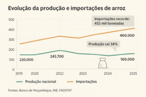 Só em 2024, Moçambique gastou 441 milhões de dólares na importação de cerca de 452 mil toneladas de arroz, um recorde que consolidou o país como um dos maiores importadores da